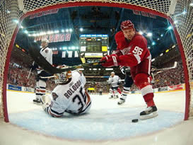 Dwayne Roloson foi batido pelo gol de Henrik Zetterberg no